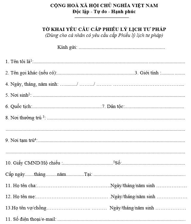 • Tờ khai yêu cầu cấp giấy lý lịch tư pháp (Mẫu số 03/2013/TT-LLTP nếu tự xin hoặc Mẫu 04/2013/TT-LLTP nếu ủy quyền xin);